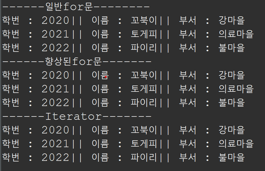 // 1. 일반for문 2.향상된for문 3.Iterator를 사용해서 출력하기