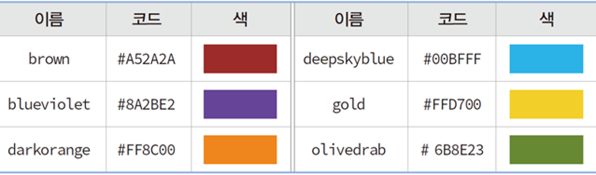 9. CSS3의 표준 색이름과 코드 중 일부