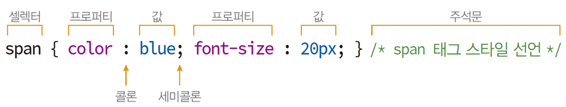 ex) <span> 텍스트를 20픽셀 blue로 출력하는 CSS3스타일시트