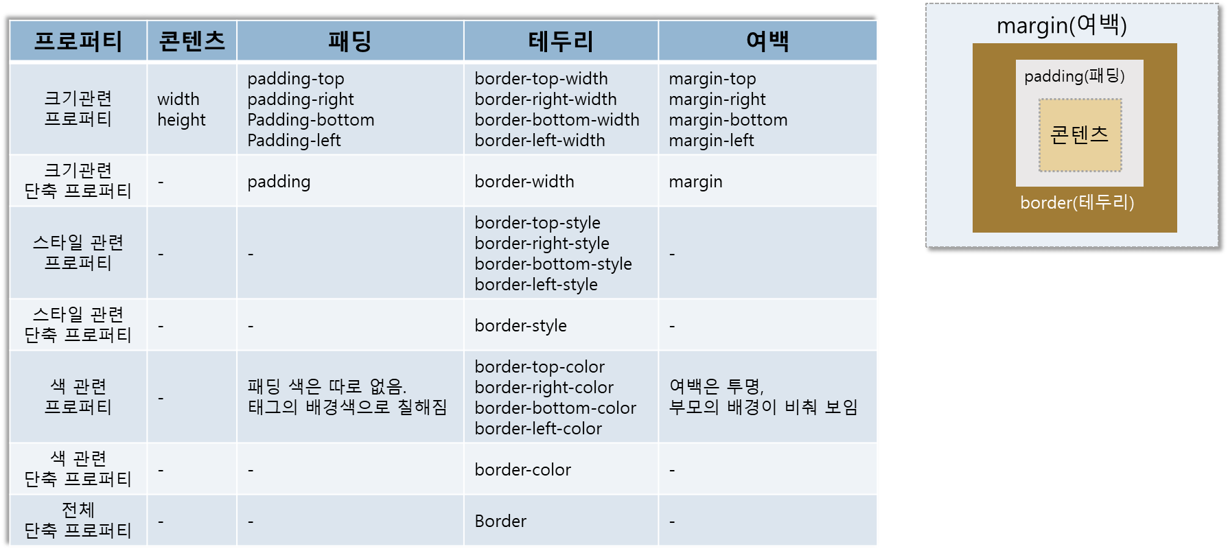 - 프로퍼티 : 스타일 속성이름, 약 200개 정도의 프로퍼티가 있다.