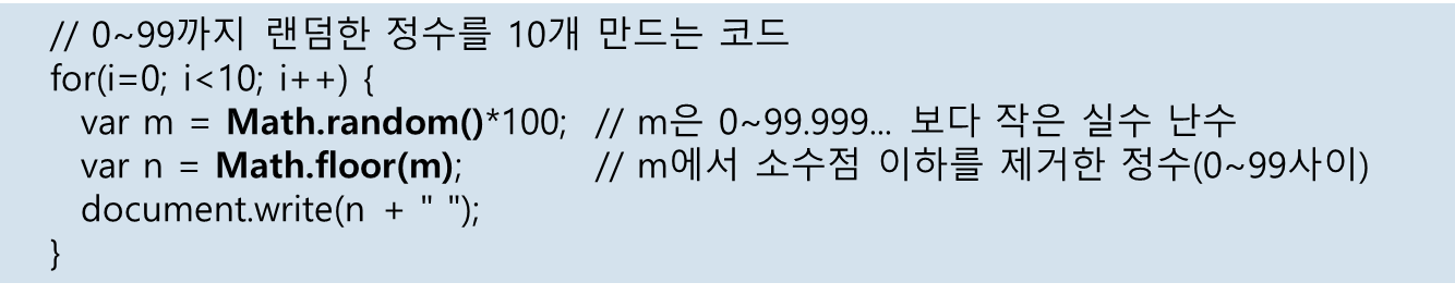 - Math.rendom() : 0 ~ 1 보다 작은 랜덤한 실수를 리턴