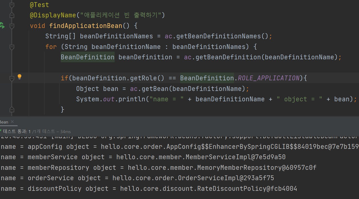 - 스프링이 내부에서 사용하는 빈은 제외하고 자신이 등록한 빈만 출력할 수 있다.
