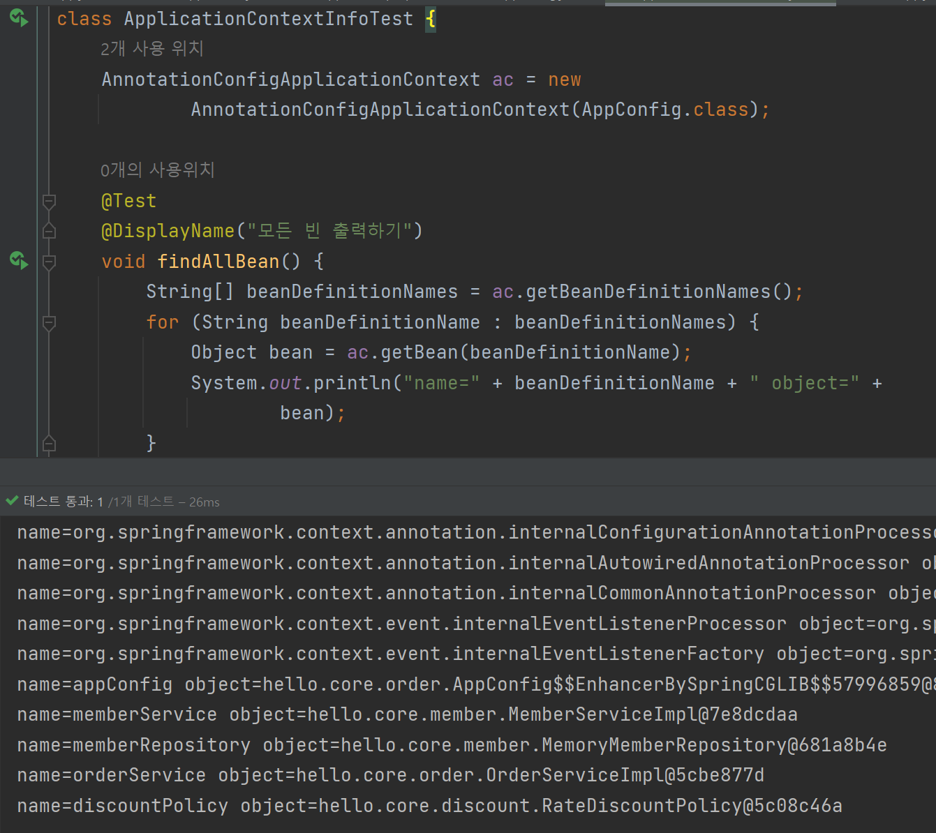 실행시 스프링에 등록된 모든 빈의 정보를 출력하여 확인할 수 있다.
