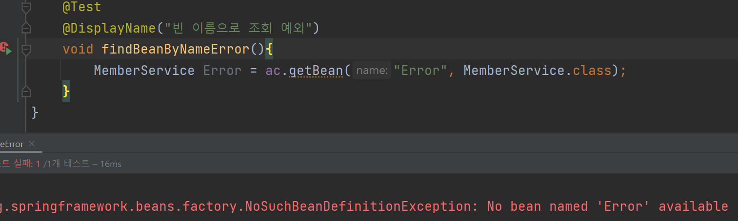 존재하지 않는 빈의 이름으로 조회할시 예외가 발생하는지 확인하는 테스트로 Error라는 이름의 테스트빈을 가정해 MemberService타입으로 조회한결과 NoSuchBeanDefinitionException 예외가 발생하는지 확인해본다.