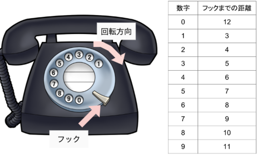 - 距離配列定義、distance配列は各数字とその数字に該当するダイヤルの距離をマッピングします。