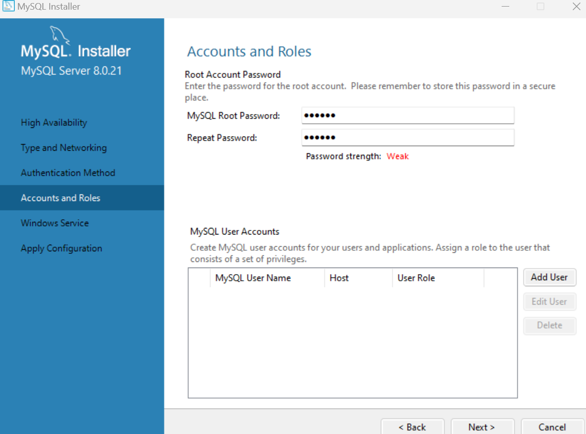 - 관리자 계정인 root계정의 비밀번호는 기억하기 쉽도록 123456 으로 설정후 Next