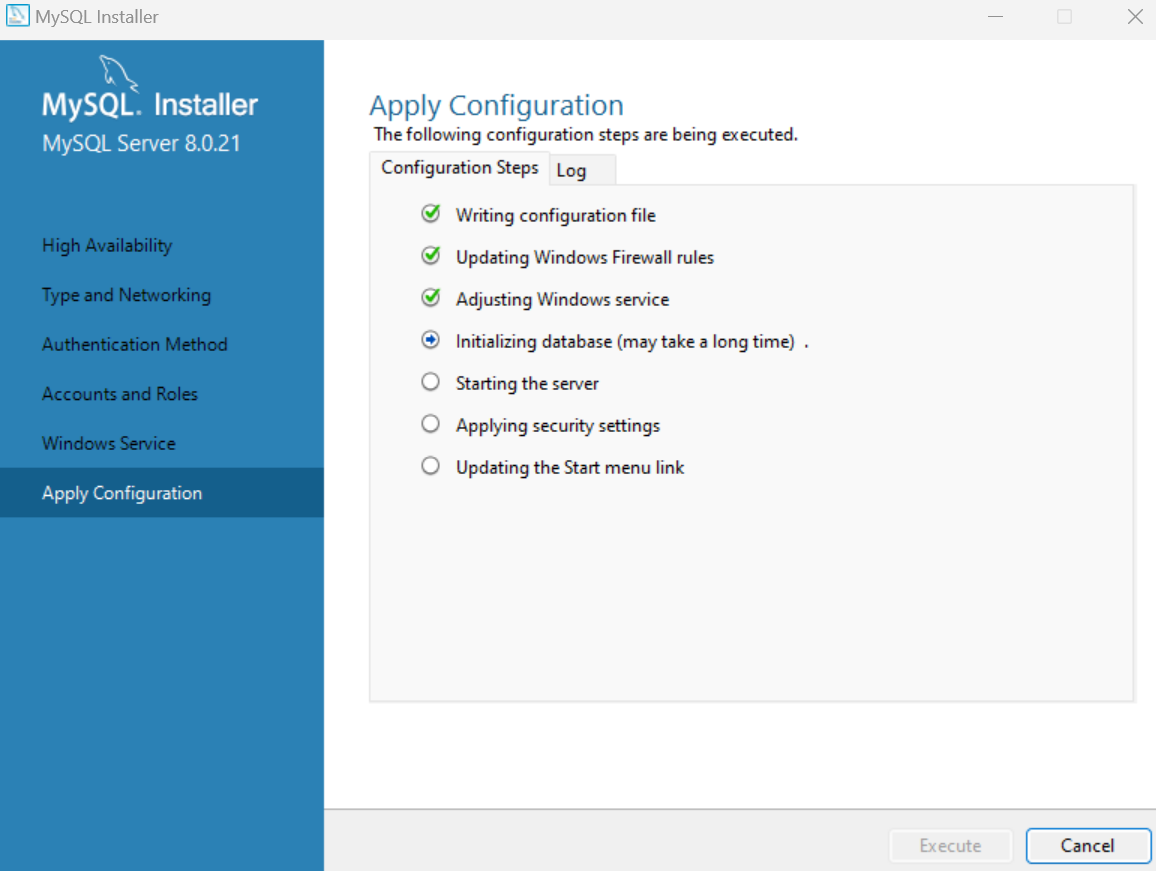 - MySQL 초기 구성 적용화면에서 기본값은 두고 Exeute