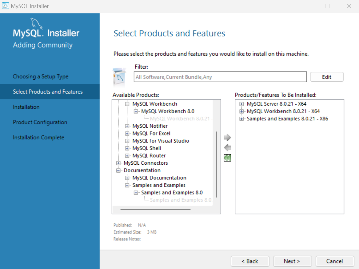 - MySQL Server 아래쪽에 MySQL Server 8.0.xx-X64 와 Connector/J 아래쪽에 위치한 Connector/J 8.0.xx-X86을 각각 선택후 오른쪽 목록으로 이동 후 Next