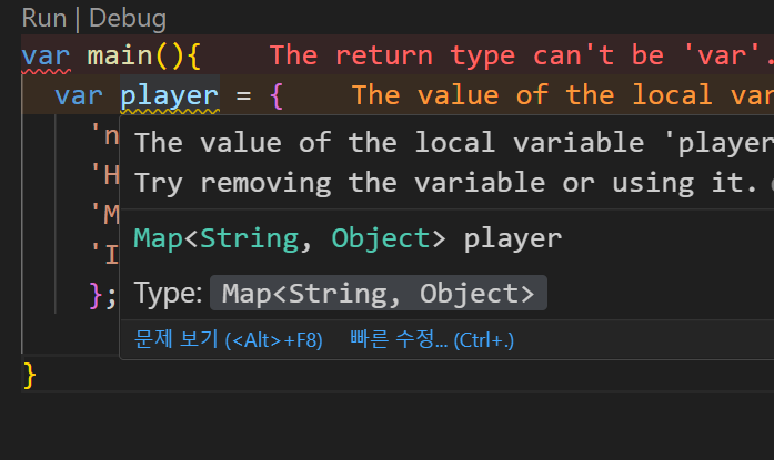 예문에서 key : value자료구조를 Map으로 만들었는데 Dart에서 자동을 key : String, value : Object로 인식한다.