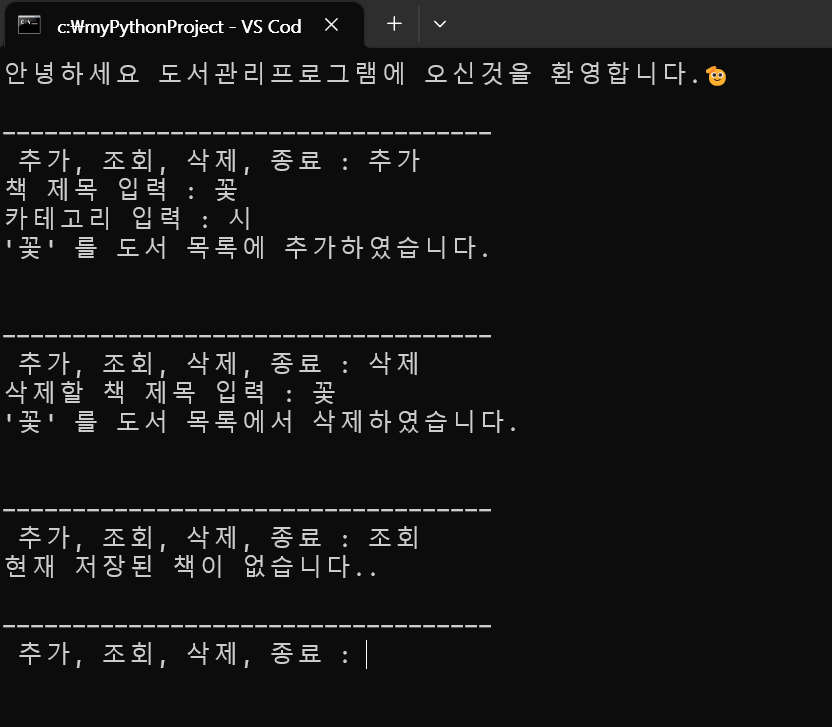 print(f"'{title}' 를 도서 목록에 추가하였습니다.\n")