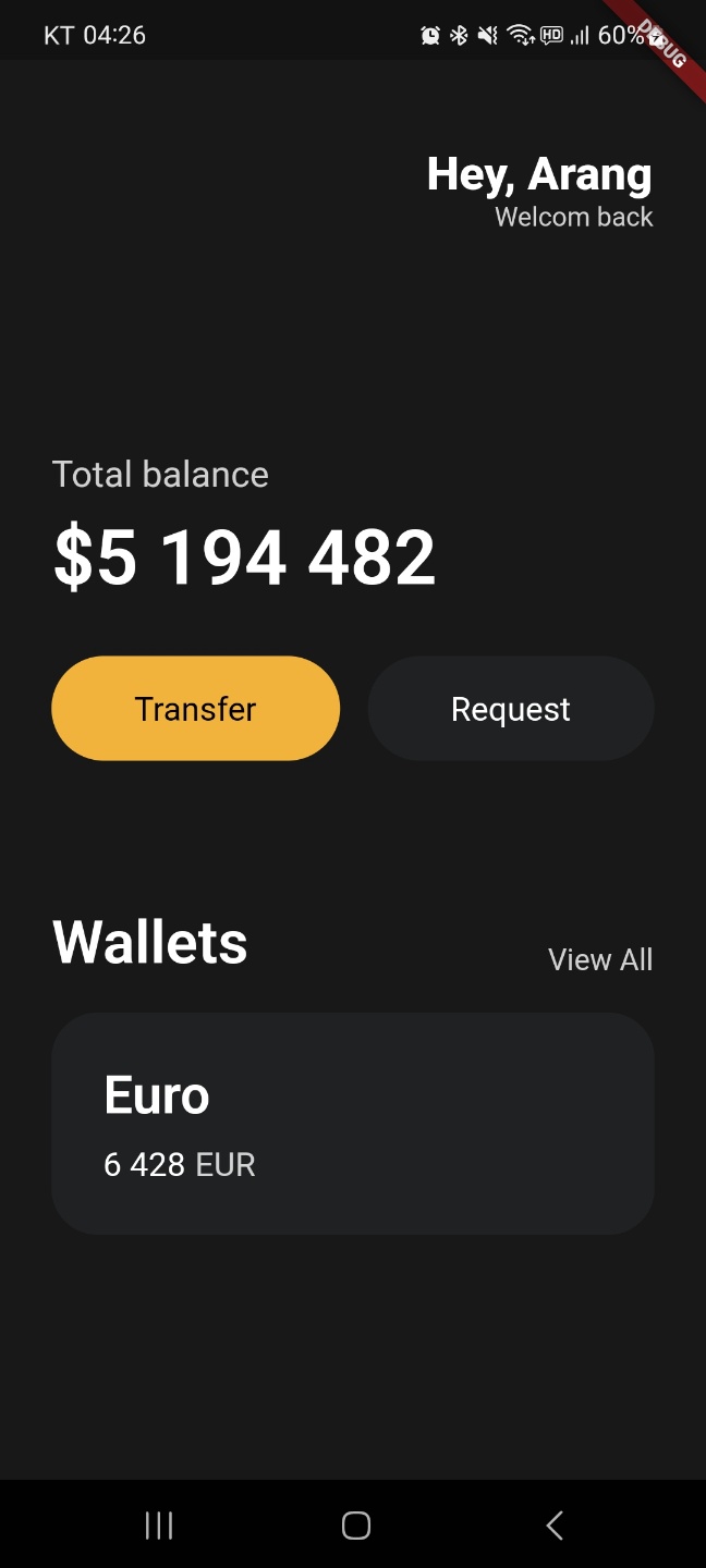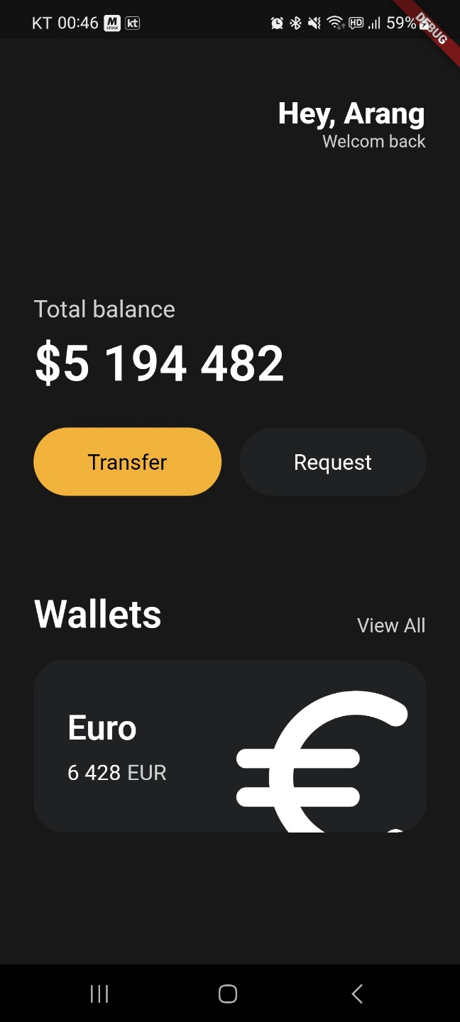 Icon : 카드의 화폐기호가 나오며 Icon.euro_rounded아이콘을 사용한다. Transform위젯으로 래핑하여 크기와 색을 조정한다.