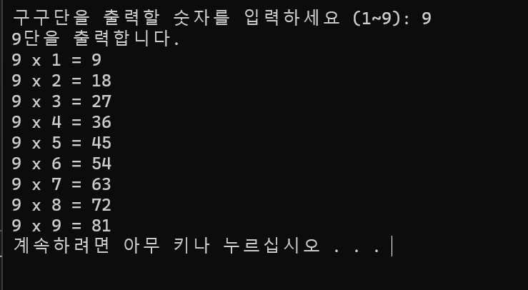 number = int(input("구구단을 출력할 숫자를 입력하세요 (1~9): "))