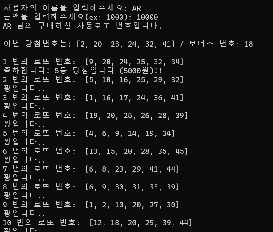 - for 반복문을 이용해 사용자가 구매한 로또의 수만큼 반복하여 출력한다. 여기서 각각의 로또 번호화 랜덤하게 생성된 당첨번호를 비교해 몇 등에 당첨되었는지 출력한다.