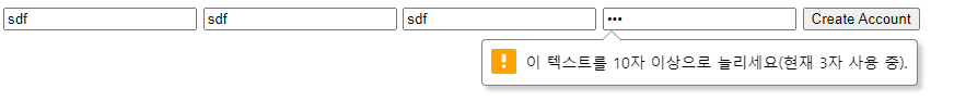 - minlength = "10" : 비밀번호 필드에 입력할 수 있는 문자열의 최소 길이를 지정한다. "10"으로 설정한 경우 사용자는 최소 10자 이상의 비밀번호를 입력해야 한다.