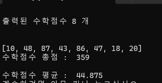 Python list 연습문제 - 0~100까지의 수학점수를 n개 입력받아 총점과 평균을 구하시오