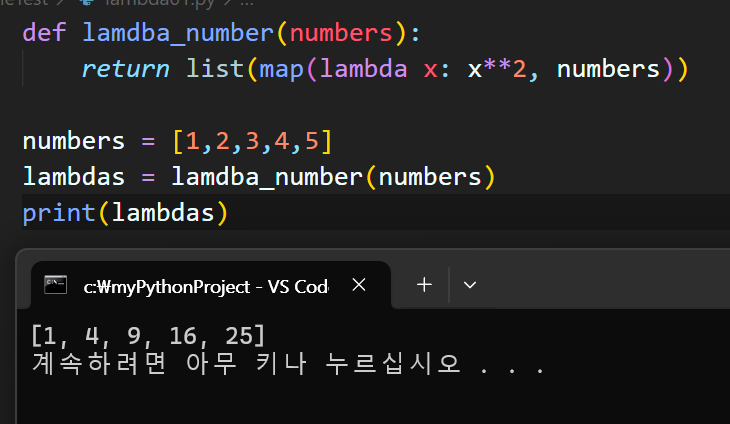 lamdba_number 리스트를 매개변수로 받아 각 요소를 제곱한 새 리스트를 변환한다.