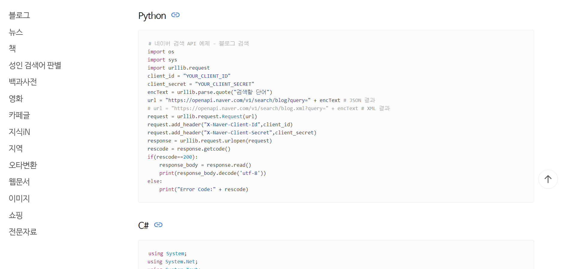 검색 API 뉴스 검색 구현 예제는 하단의 [검색 API뉴스 검색 구현 예제] 부분의 [검색 API블로그 검색 구현 예제] 링크를 통해 접근할 수 있다.