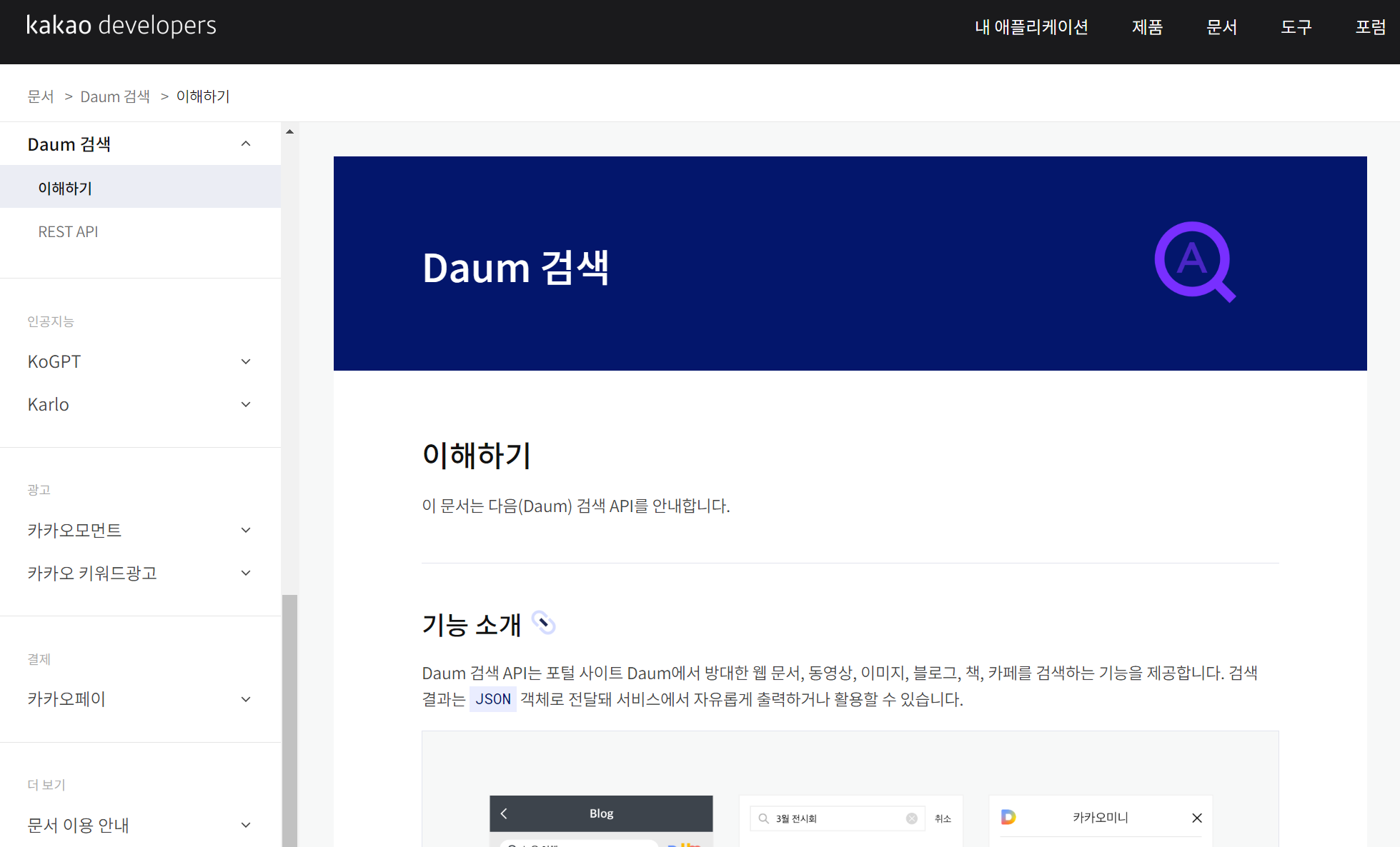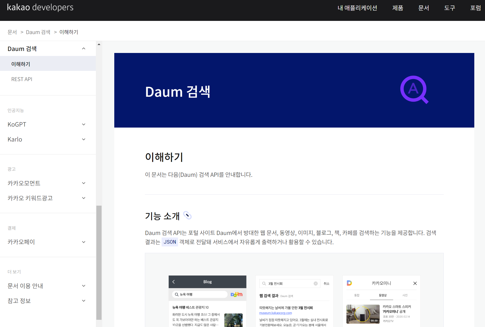 3. [Daum 검색] - [이해하기] 를 선택하면 다음검색 API에 대해 다양한 기능을 설명한다. Daum검색 API는 포털 사이트 Daum에서 방대한 웹 문서, 동영상, 이미지, 블로그, 책, 카페를 검색하는 기능을 제공하며 검색 결과는 JSON객체로 전달되어 서비스에서 자유롭게 출력하거나 활용할 수 있다.