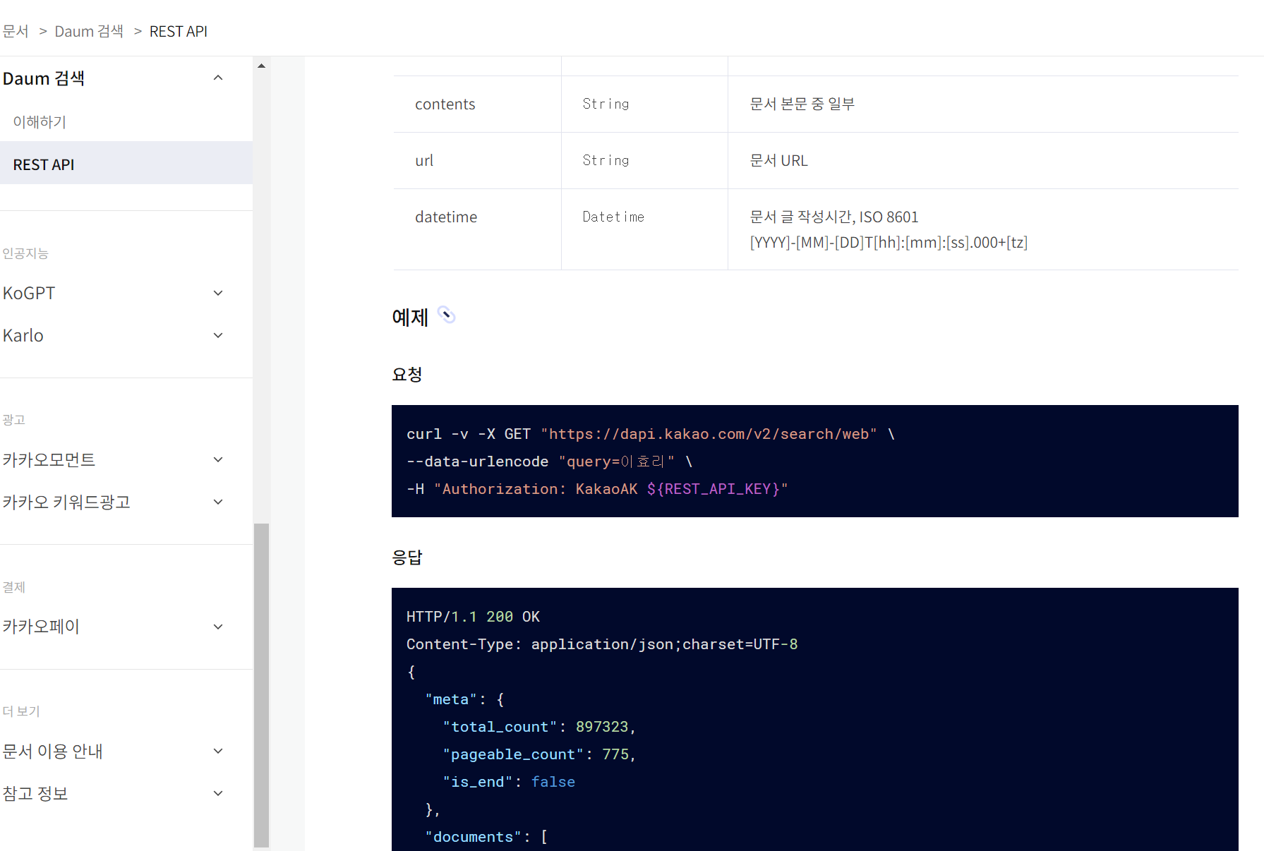 2. 상단 [문서]를 클릭하며 [검색 API가이드]의 [Daum검색]을 선택