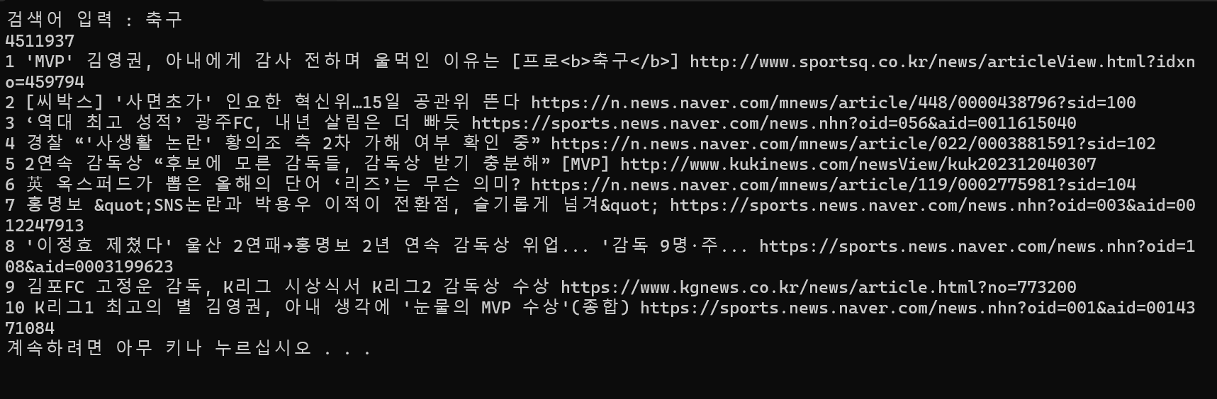 - 성공적으로 200 응답이 나오면 JSON형식의 응답 본문을 파싱해 뉴스 기사의 제목과 링크를 출력한다.