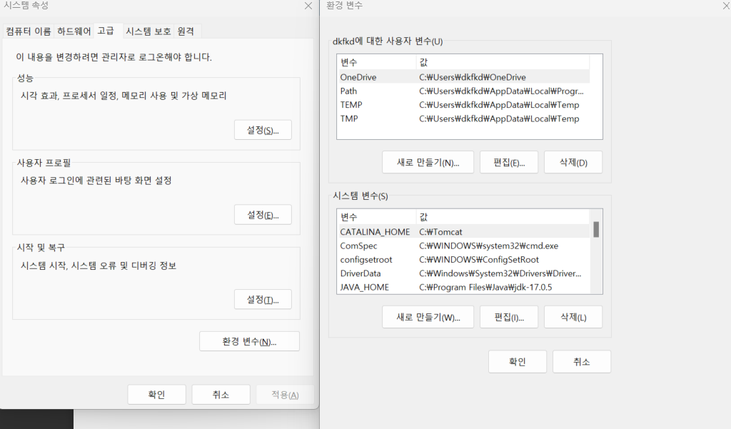 환경변수 창에서 [새로만들기]