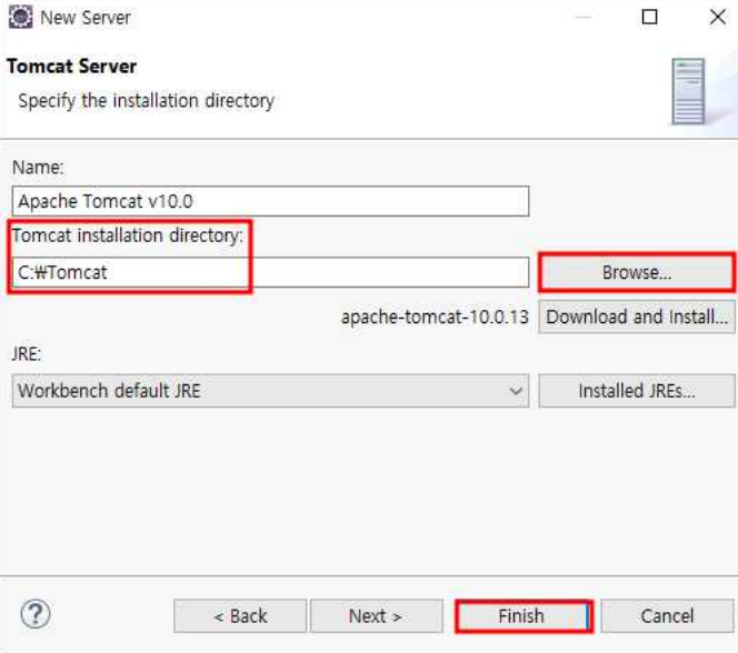 15. next후 [Browse...]을 클릭해 Tomcat을 설치한 폴더(C:\Tomcat)를 선택하여 지정하여 주고 아래의 [Finish] 클