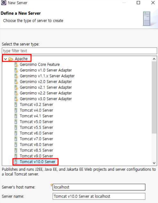 14. Tomcat v10.0 Server를 선택하고 [Next] 버튼을 선택한다.