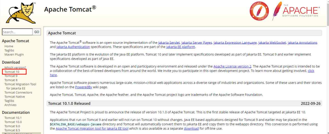 3. Tomcat 다운로드 및 설치하기 : tomcat.apache.org에 접속하여 왼쪽의 [Download] 메뉴에서 Tomcat 10 을 클릭한다.