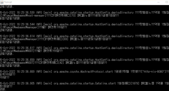 10. C:\Tomcat\bin 폴더에 startup.bat 파일을 실행한 결과 커맨드 창이 떠 있으면 성공. (커맨드 창이 뜨지 않는 경우 : 깜빡거리고 꺼지는 현상 == 환경변수를 잘못 잡았을 확률이 높다)