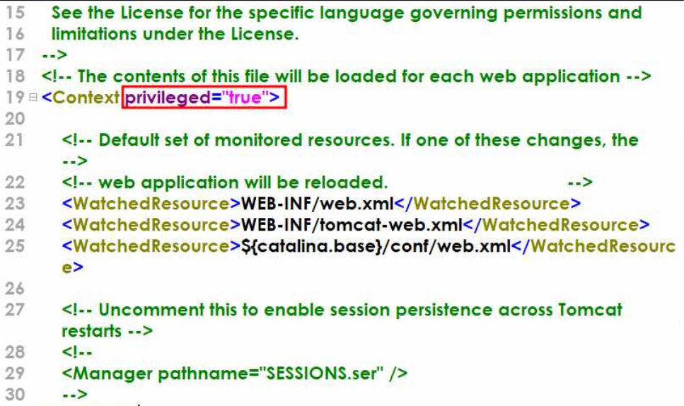 8. C:\Tomcat\conf 폴더 안의 context.xml 파일을 열어서 19 <Context privileged="true">로 수정한다.