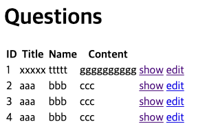 - 各質問に対してshowとeditリンクを提供する。edit_question_path(question)は該当する質問の修正Formに移動するリンクを生成する。
