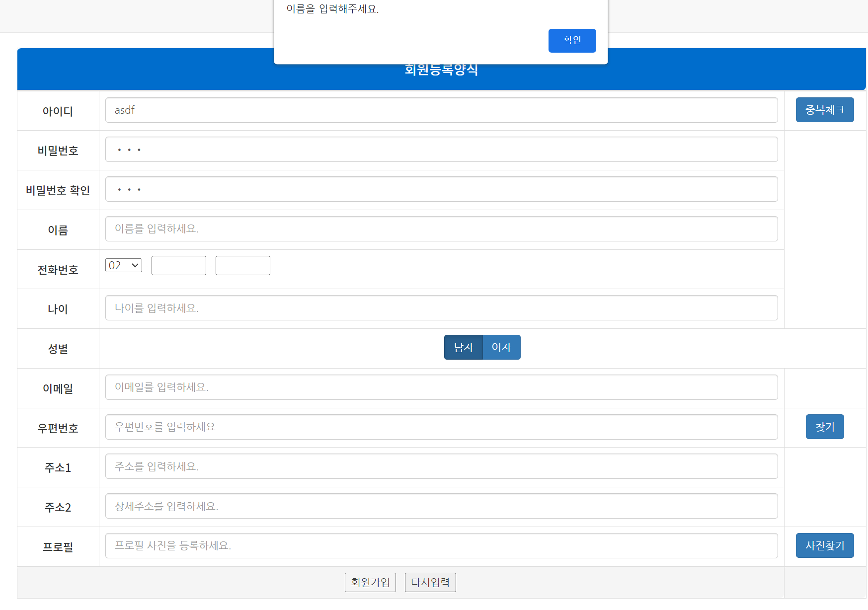 회원가입 : 미입력시 입력하세요 스크립트 띄우기 수정, DAO수정, 회원가입 DB처리, 우편번호형식, 프로필사진