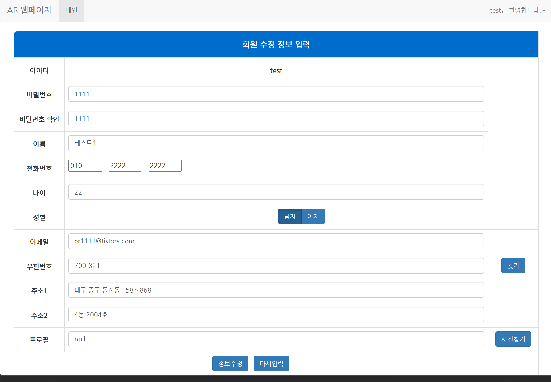 지난시간에는 회원가입과 로그인구현을 완성하였고 이번시간에는 등록된 회원의 정보를 수정하는 페이지를 구현해보겠다.