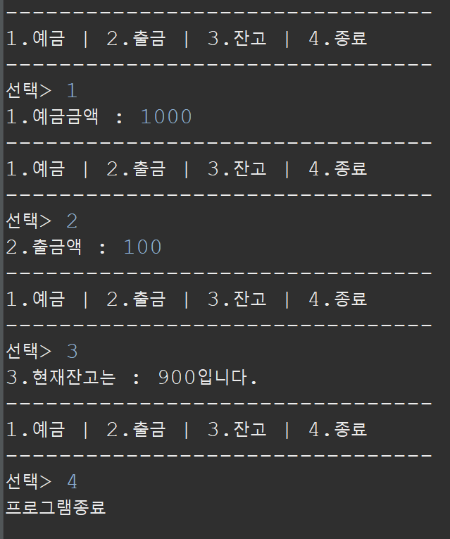 7. while문과 Scanner를 이용해서 키보드로부터 입력된 데이터로 예금, 출금, 조회, 종료 기능을 제공하는 코드를 작성해보세요. 이 프로그램을 실행시키면 다음과 같은 실행결과가 나와야합니다.