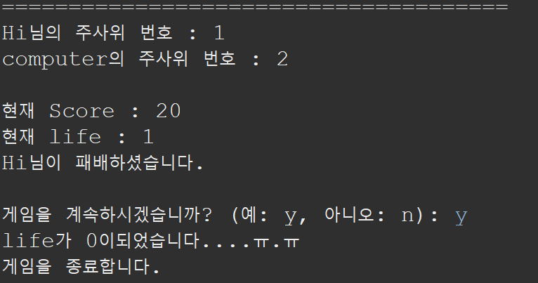 2. 한게임이 끝나면 다시 게임을 시작할지 물어보고 y진행 n그만두기 입니다.