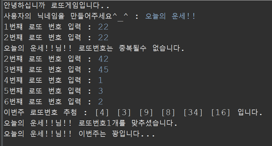 System.out.println(name + "님!! 로또번호는 중복될수 없습니다.");